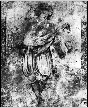 first mentioned in 1611, had 17th-century wall paintings which were discovered in 1966. One showed a lute player (below right) in full breeches and hose tied at the knee with garters,