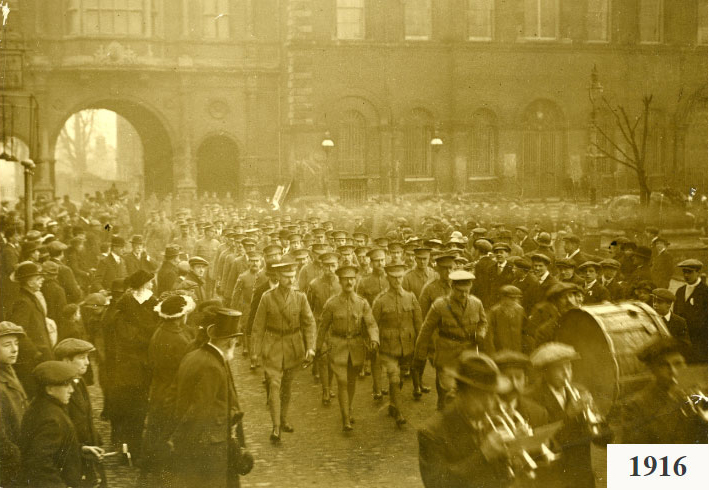 LEFT: Volunteers marching Through Aylesbury's Market Square in 1915.